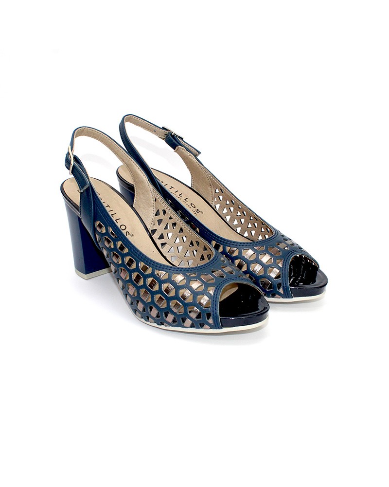 Salón de tacón alto , en piel calada en marino y con tiras plata. Con plataforma interior de 1 cm , que lo hace un calzado muy cómodo y confortable para las grandes ocasiones. Para los vestidos veraniegos.